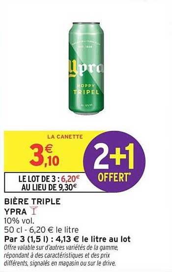 Découvrez dès maintenant la offre BIÈRE TRIPLE YPRA dans le catalogue de Intermarché. Cette offre est valable du 02/09/2025 au 07/09/2025.