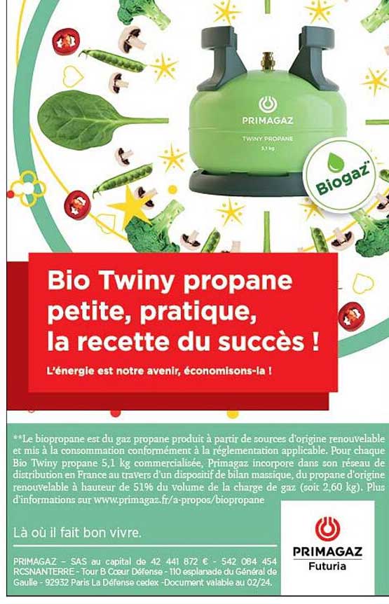 Offre de Bio Twiny Propane Petite, Pratique, La Recette Du Succès ! chez Intermarché