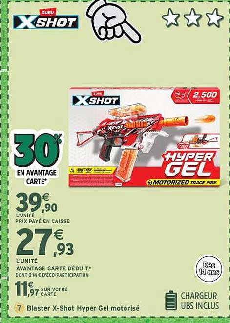 Découvrez le Blaster X-Shot Hyper Gel motorisé, l'ultime compagnon de jeu pour vos moments de loisir. Avec sa capacité de 2500 billes, cet équipement est parfait pour des heures de divertissement, que ce soit en intérieur ou en extérieur. Grâce à cette offre exceptionnelle, profitez d'une réduction de 30 % avec votre carte Intermarché, rendant ce jouet encore plus attractif pour les petits comme pour les grands.
