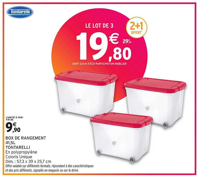 Découvrez l'offre de Box De Rangement 41,5L Tontarelli chez Intermarché! Cette offre fantastique est maintenant disponible dans le nouveau catalogue de Intermarché. Profitez de cette occasion et économisez considérablement sur votre achat.