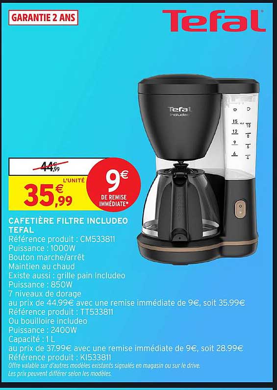 Découvrez l'offre de Cafetière Filtre Includeo Tefal chez Intermarché! Cette offre fantastique est maintenant disponible dans le nouveau catalogue de Intermarché. Profitez de cette occasion et économisez considérablement sur votre achat.