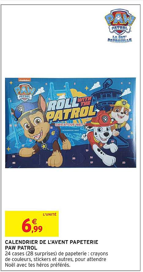 Découvrez dès maintenant la offre CALENDRIER DE L'AVENT PAPETERIE PAW PATROL dans le catalogue de Intermarché. Cette offre est valable du 13/11/2025 au 23/11/2025.