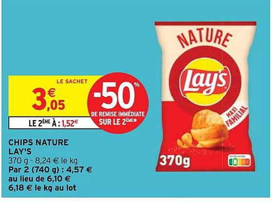 Découvrez l'offre de Chips Nature Lay's chez Intermarché! Cette offre fantastique est maintenant disponible dans le nouveau catalogue de Intermarché. Profitez de cette occasion et économisez considérablement sur votre achat.