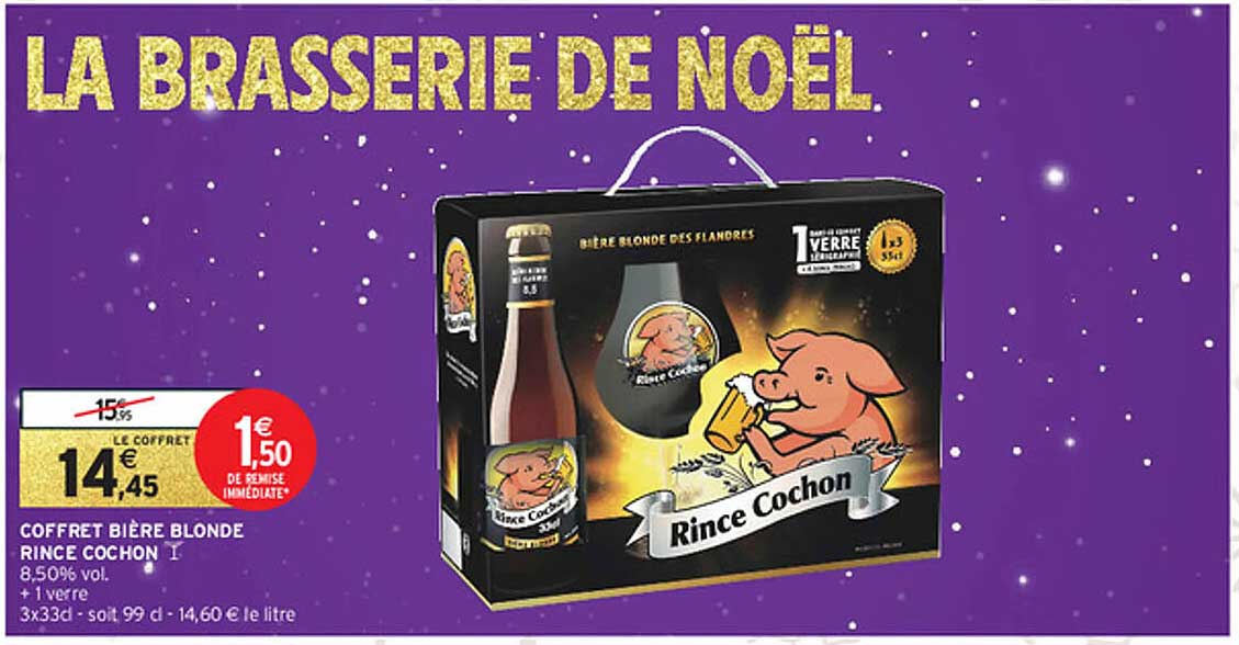 Découvrez l'offre de Coffret Bière Blonde Rince Cochon chez Intermarché! Cette offre fantastique est maintenant disponible dans le nouveau catalogue de Intermarché. Profitez de cette occasion et économisez considérablement sur votre achat.