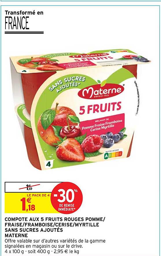 Offre de Compote Aux 5 Fruits Pomme/Fraise/Framboise/Cerise/Myrtille Sans Sucres Ajoutés Materne chez Intermarché