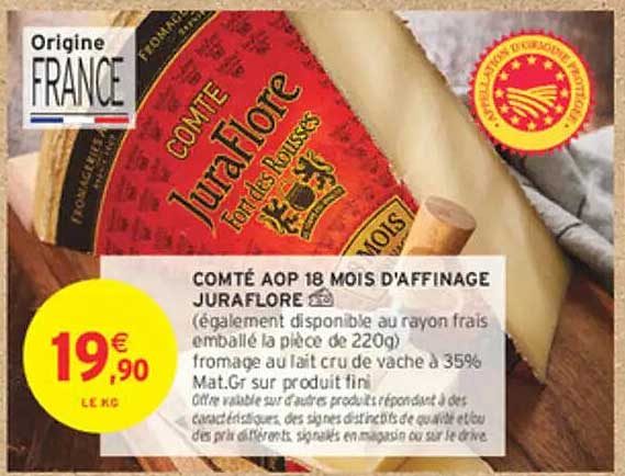 Découvrez l'exceptionnelle offre du Comté AOP 18 mois d'affinage Juraflore, un fromage d'origine française au goût riche et délicat. Ce produit est parfait pour les amateurs de fromages raffinés et une véritable trouvaille pour égayer vos apéritifs, vos plats ou simplement pour un moment de gourmandise. Profitez de cette offre exceptionnelle valable jusqu'au 27 avril 2025 !