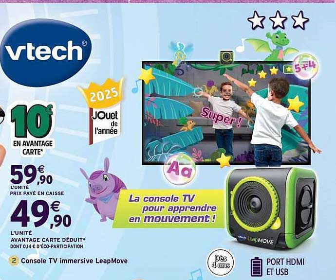 Découvrez la console TV immersive LeapMove de Vtech, un jouet qui allie apprentissage et mouvement ! Avec une animation engageante et interactive, ce jouet à été élu 'Jouet de l'année 2025'. Il permet aux enfants de s'amuser tout en apprenant à travers des jeux éducatifs attractifs, parfaits pour favoriser le développement cognitif et moteur des plus petits.