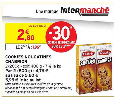 Découvrez les délicieux cookies nougatines Chabrior en promotion chez Intermarché ! Ces petites douceurs, parfaites pour accompagner votre café ou simplement pour satisfaire une envie sucrée, sont disponibles avec une remise exceptionnelle. Pour un plaisir gustatif à partager, c’est le moment idéal pour faire le plein !