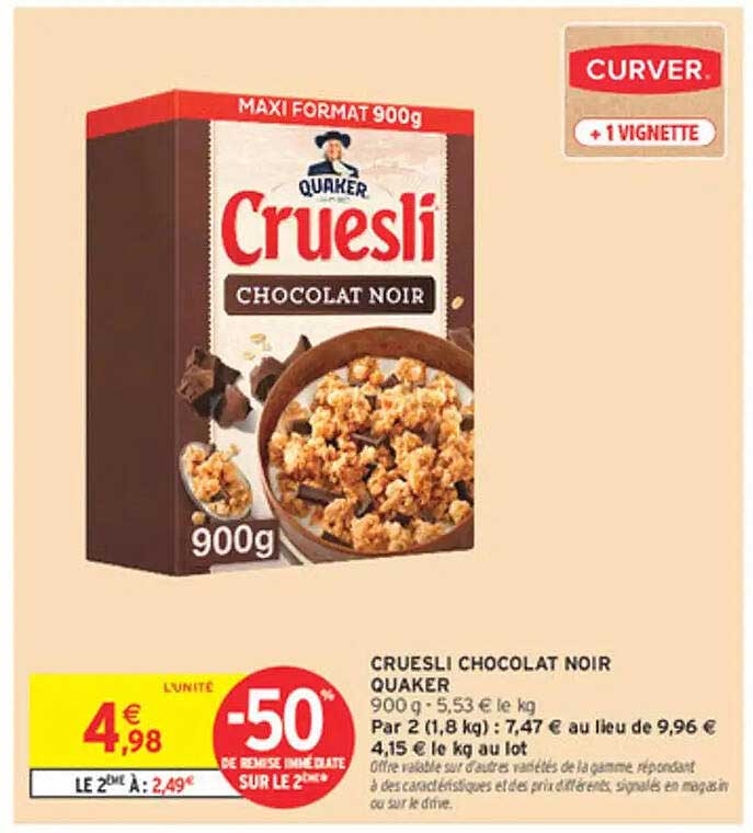 Découvrez le Cruesli Chocolat Noir de Quaker, une délicieuse option pour démarrer la journée ou pour une pause gourmande. Ce mélange croustillant vous séduira avec ses morceaux de chocolat noir riches en saveur. Une offre à ne pas manquer sur cette page, valable jusqu’au 27 avril 2025.