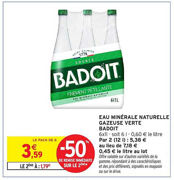 Découvrez l'offre de Eau Minérale Naturelle Gazeuse Verte Badoit chez Intermarché! Cette offre fantastique est maintenant disponible dans le nouveau catalogue de Intermarché. Profitez de cette occasion et économisez considérablement sur votre achat.