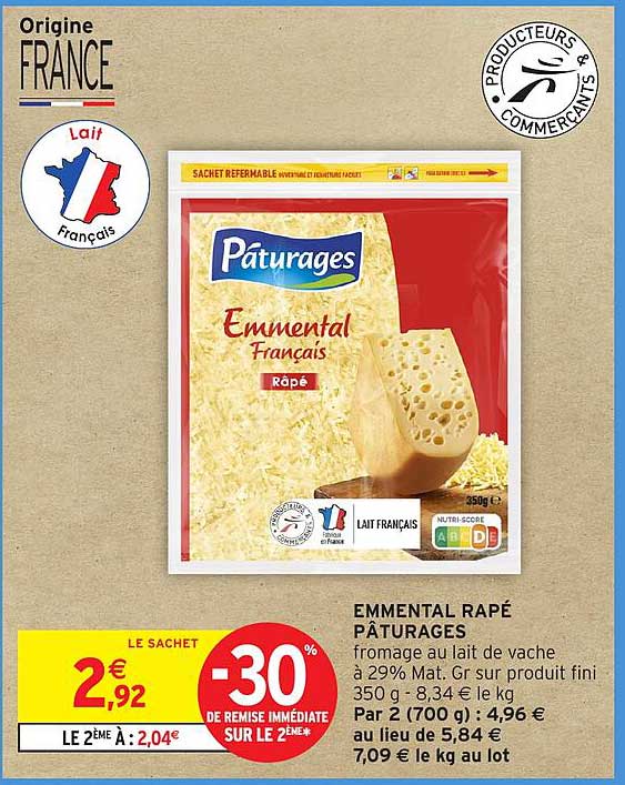 Découvrez l'offre de Emmental Râpé Pâturages chez Intermarché! Cette offre fantastique est maintenant disponible dans le nouveau catalogue de Intermarché. Profitez de cette occasion et économisez considérablement sur votre achat.