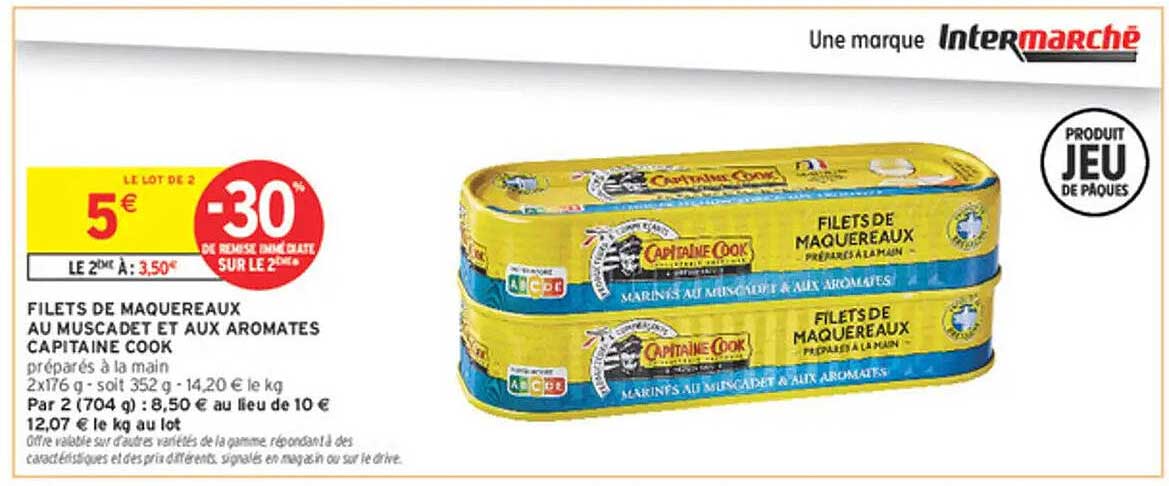 Découvrez dès maintenant la offre FILETS DE MAQUEREAUX AU MUSCADET ET AUX AROMATES CAPITAINE COOK dans le catalogue de Intermarché. Cette offre est valable du 15/04/2025 au 27/04/2025.