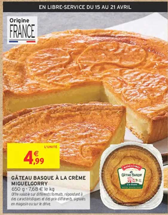 Découvrez dès maintenant la offre GÂTEAU BASQUE À LA CRÈME MIGUELGORY dans le catalogue de Intermarché. Cette offre est valable du 15/04/2025 au 27/04/2025.