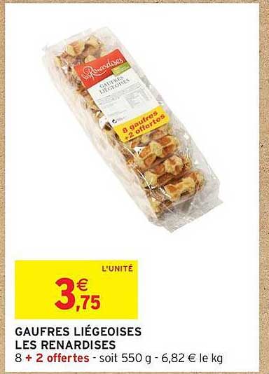 Découvrez l'offre de Gaufres Liégeoises Les Renardises chez Intermarché! Cette offre fantastique est maintenant disponible dans le nouveau catalogue de Intermarché. Profitez de cette occasion et économisez considérablement sur votre achat.