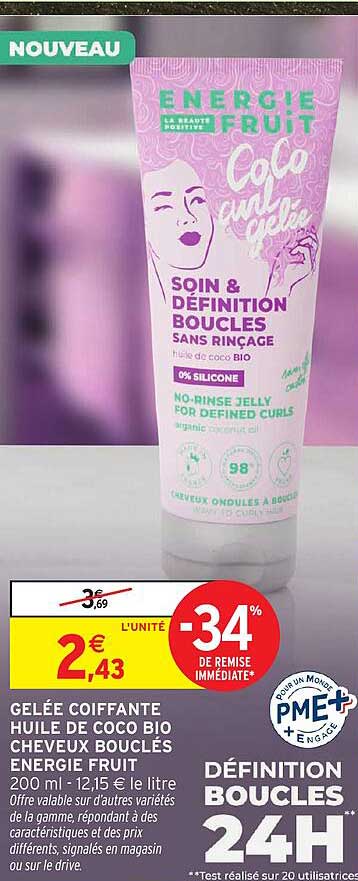 Offre de Gelée Coiffante Huile De Coco Bio Cheveux Bouclés Énergie Fruit chez Intermarché