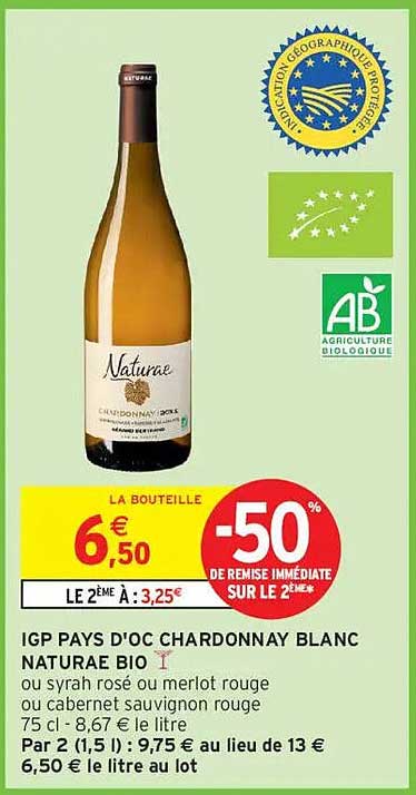 Découvrez l'offre de Igp Pays D'oc Chardonnay Blanc Naturae Bio chez Intermarché! Cette offre fantastique est maintenant disponible dans le nouveau catalogue de Intermarché. Profitez de cette occasion et économisez considérablement sur votre achat.