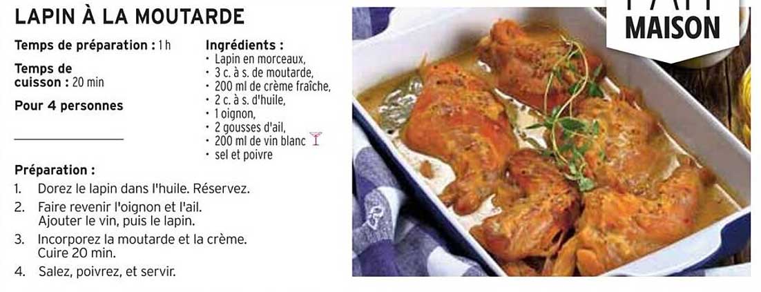 Découvrez la superbe offre de Lapin À La Moutarde dans le nouveau catalogue de Intermarché. En plus de cette offre, vous trouverez de nombreuses autres réductions attrayantes. Vous pouvez facilement commander le Lapin À La Moutarde en ligne via le site web de Intermarché ou l'acheter dans un magasin près de chez vous.