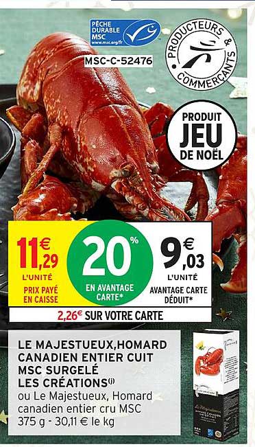 Offre de Le Majestueux, Homard Canadien Entier Cuit Msc Surgelé Les Créations chez Intermarché