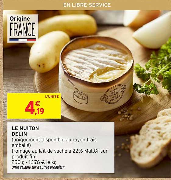 Découvrez le Nuiton Delin, un fromage au lait de vache à 22% de matière grasse, qui se démarque par sa texture crémeuse et son goût raffiné. Disponible uniquement au rayon frais, ce fromage est parfait pour agrémenter vos plats ou en apéritif accompagné d'un bon pain. Profitez de cette offre exceptionnelle valable jusqu'au 2 novembre 2025.