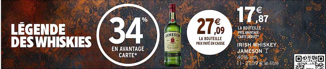 Découvrez une offre incontournable sur le célèbre Irish Whiskey Jameson qui ravira les amateurs de spiritueux. Pendant la période du 21 octobre au 2 novembre 2025, Intermarché vous propose une promotion alléchante qui vous permet de savourer cet excellent whisky à un prix réduit. Ne manquez pas cette occasion de faire le plein pour vos soirées ou vos apéritifs en famille ou entre amis.