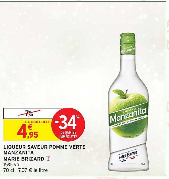Découvrez dès maintenant la offre LIQUEUR SAVEUR POMME VERTE MANZANITA MARIE BRIZARD dans le catalogue de Intermarché. Cette offre est valable du 10/12/2024 au 22/12/2024.