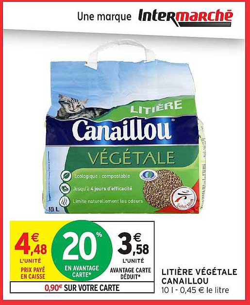 Découvrez l'offre de Litière Végétale Canaillou chez Intermarché! Cette offre fantastique est maintenant disponible dans le nouveau catalogue de Intermarché. Profitez de cette occasion et économisez considérablement sur votre achat.
