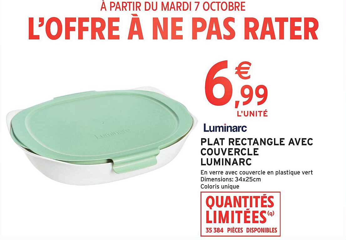 Vous recherchez un plat pratique et esthétique pour vos repas ? Ne cherchez plus ! A partir du 7 octobre, Intermarché vous propose un magnifique plat rectangle avec couvercle de Luminarc à un prix défiant toute concurrence. Ce plat est parfait pour la cuisson au four ou le stockage au réfrigérateur, tout en étant très élégant pour la table.