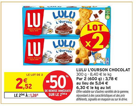 Découvrez dès maintenant la offre LULU L'OURSON CHOCOLAT dans le catalogue de Intermarché. Cette offre est valable du 25/03/2025 au 06/04/2025.