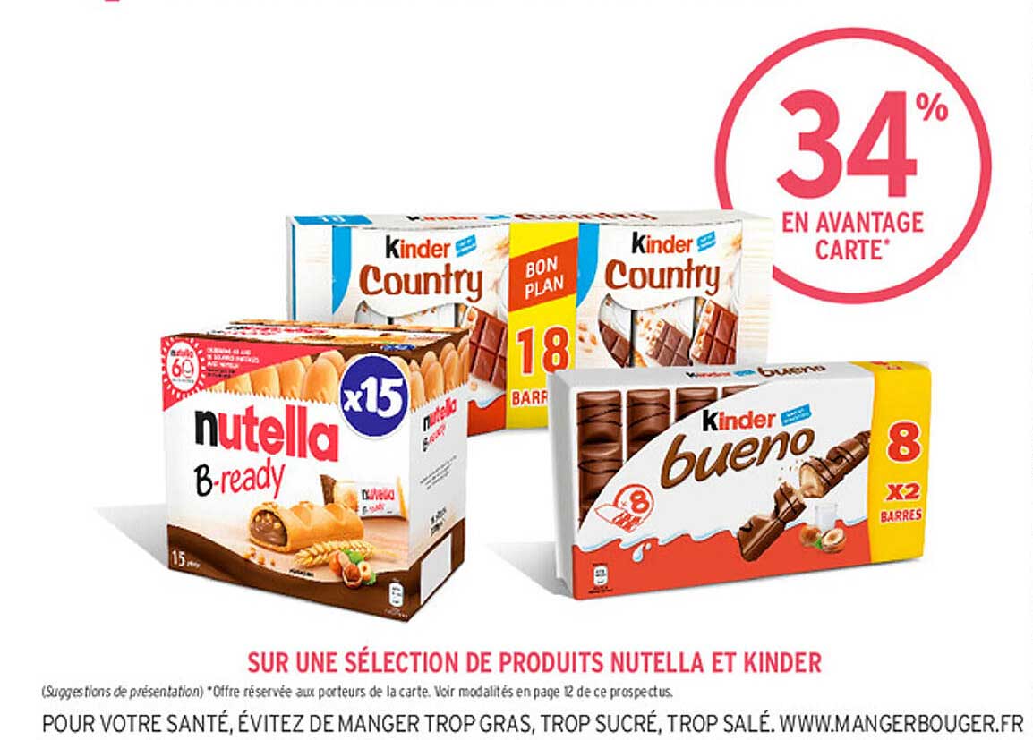 Découvrez dès maintenant la offre Nutella B-ready x15 Kinder Country Kinder bueno 8 X2 BARRES dans le catalogue de Intermarché. Cette offre est valable du 27/08/2024 au 08/09/2024.