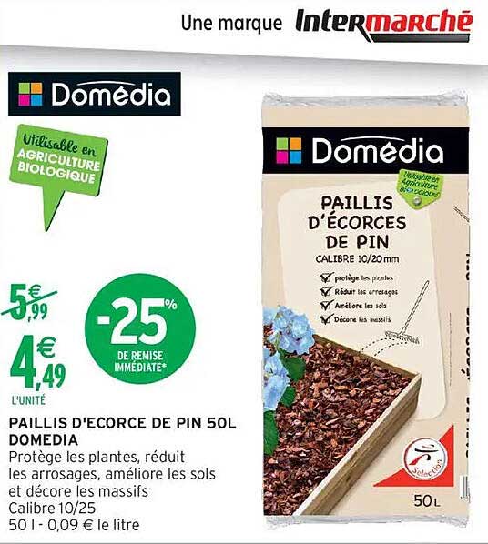 Découvrez l'offre de Paillis D'écorce De Pin 50L Domedia chez Intermarché! Cette offre fantastique est maintenant disponible dans le nouveau catalogue de Intermarché. Profitez de cette occasion et économisez considérablement sur votre achat.