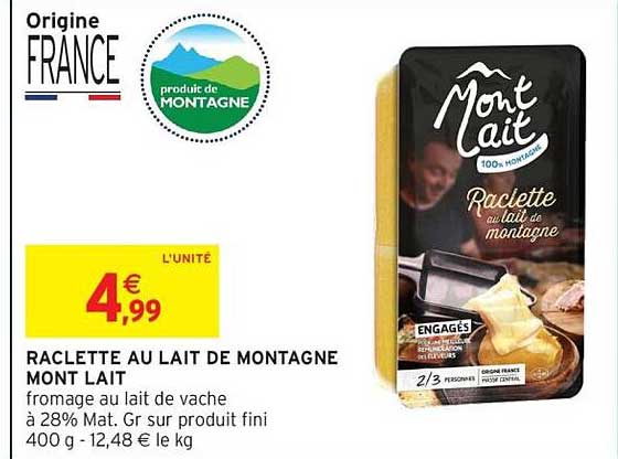 Amateurs de fromage, cette promotion est faite pour vous ! Découvrez la Raclette au lait de montagne Mont Lait à un prix irrésistible. À seulement 4,99 €, cette délicieuse raclette se distingue par sa teneur en matières grasses de 28 % et son authenticité, provenant de notre belle France. C'est le moment idéal pour régaler vos proches lors d'un repas convivial autour de la raclette.