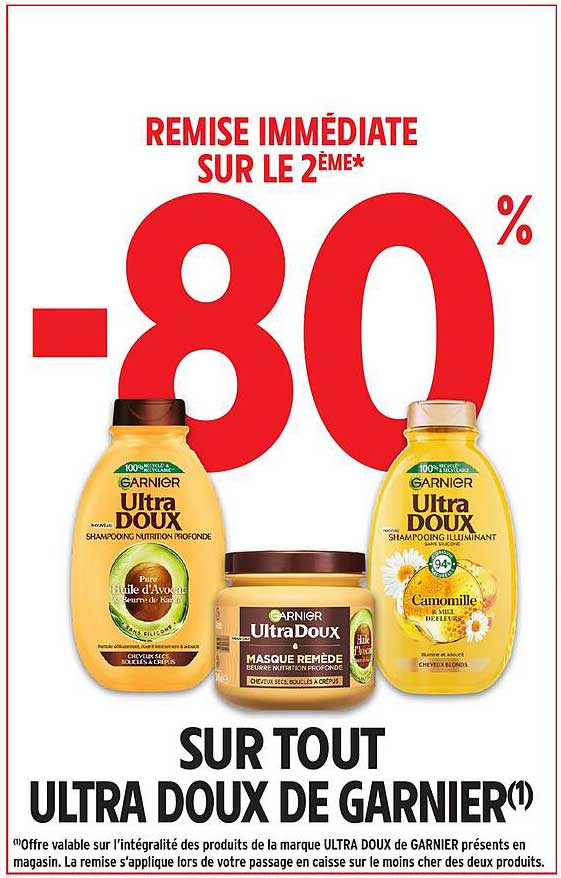 Imaginez le prix habituel des produits Garnier Ultra Doux, et maintenant, pensez à la richesse de cette offre : vous ne payez que la moitié lors de votre seconde acquisition. C’est une occasion à ne pas manquer pour faire le plein de produits de qualité à prix réduit.
