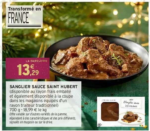 Découvrez l'offre de Sanglier Sauce Saint Hubert chez Intermarché! Cette offre fantastique est maintenant disponible dans le nouveau catalogue de Intermarché. Profitez de cette occasion et économisez considérablement sur votre achat.