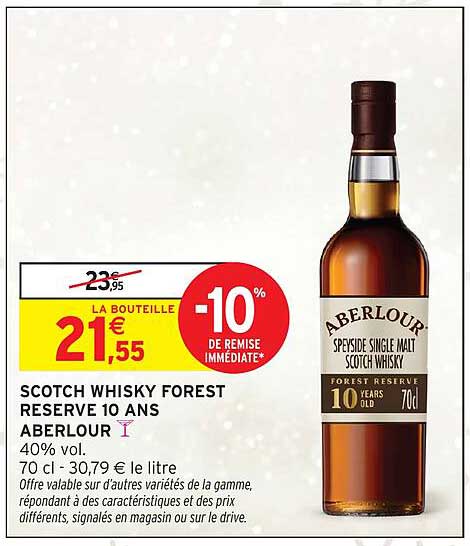Découvrez l'offre de Scotch Whisky Forest Reserve 10 Ans Aberlour chez Intermarché! Cette offre fantastique est maintenant disponible dans le nouveau catalogue de Intermarché. Profitez de cette occasion et économisez considérablement sur votre achat.