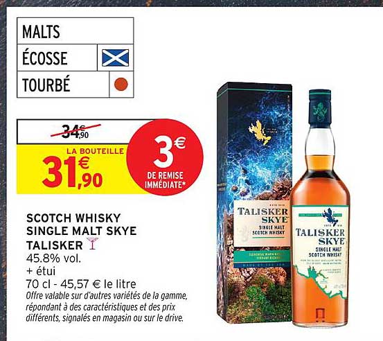 Découvrez dès maintenant la offre SCOTCH WHISKY SINGLE MALT SKYE TALISKER dans le catalogue de Intermarché. Cette offre est valable du 21/10/2025 au 02/11/2025.