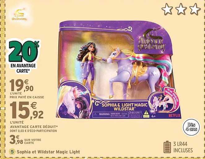 Découvrez le monde enchanté de Sophia et Wildstar Magic Light ! Cette offre vous permet d'acquérir ce magnifique ensemble de jouets au prix réduit. Avec 20% d'avantage carte, c'est le moment idéal pour faire plaisir à vos petits aventuriers. Les enfants vont adorer recréer leurs scènes préférées de Netflix avec ces personnages attachants.