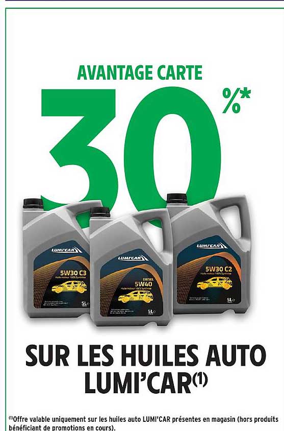 Profitez d'une remise exceptionnelle de 30% sur les huiles auto LUMI’CAR dans votre Intermarché. Cette offre valable du 21 octobre au 2 novembre 2025 est une occasion à ne pas manquer pour tous les passionnés d'automobile et les conducteurs soucieux de la qualité de leur moteur. Les huiles LUMI’CAR sont conçues pour optimiser la performance de votre véhicule tout en garantissant une protection maximale.
