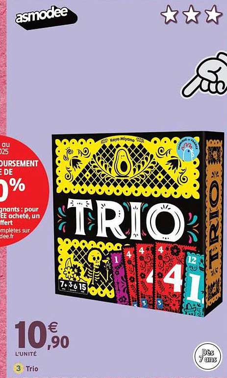 Découvrez le jeu TRIO, un divertissement ludique qui promet des heures de fun en famille ou entre amis ! Ce jeu captivant, signé Asmodee, est parfait pour les enfants à partir de 7 ans et peut être joué de 3 à 15 joueurs. Laissez-vous séduire par cette offre unique valable jusqu'au 7 décembre 2025 !