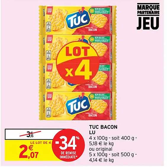 Découvrez l'offre de Tuc Bacon chez Intermarché! Cette offre fantastique est maintenant disponible dans le nouveau catalogue de Intermarché. Profitez de cette occasion et économisez considérablement sur votre achat.