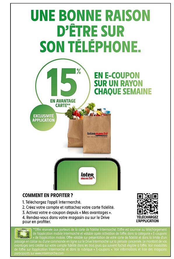 Découvrez une promotion exceptionnelle réservée aux utilisateurs de l'application Intermarché ! Du 14 au 26 octobre 2025, vous aurez l'opportunité de bénéficier d'une réduction de 15 % en e-coupon sur un rayon chaque semaine. C'est une manière idéale de faire des économies tout en profitant de vos courses hebdomadaires.