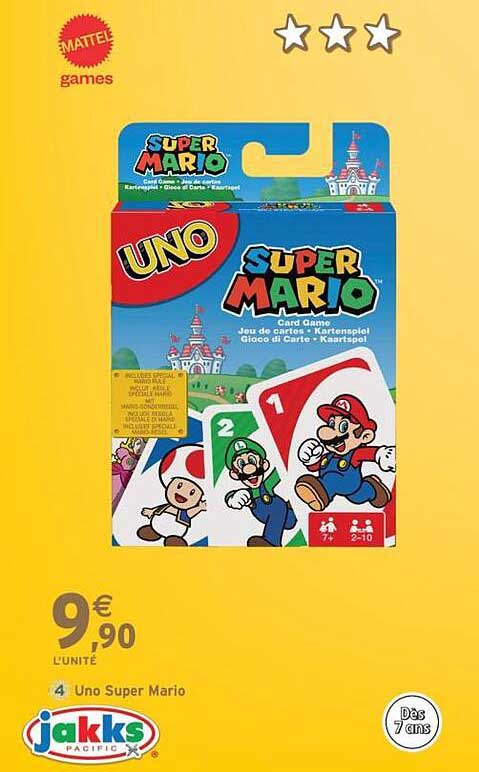 Découvrez le jeu de cartes incontournable, Uno Super Mario, qui allie le classique Uno à l'univers amusant de Mario. Parfait pour des moments en famille ou entre amis, ce jeu promet des heures de divertissement. Profitez de cette offre valable jusqu'au 7 décembre 2025 et ajoutez une touche de fun à vos soirées jeux.