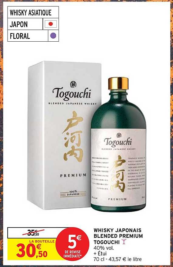 Découvrez l'offre de Whisky Japonais Blended Premium Togouchi chez Intermarché! Cette offre fantastique est maintenant disponible dans le nouveau catalogue de Intermarché. Profitez de cette occasion et économisez considérablement sur votre achat.