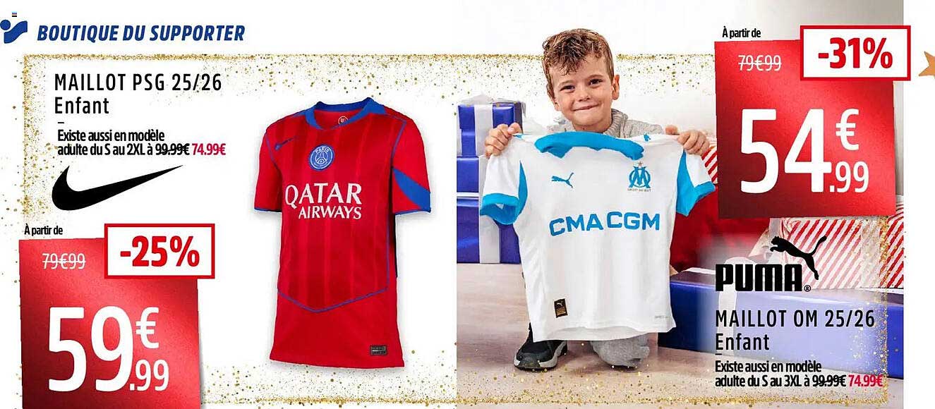 Profitez d'une réduction de 25% sur un prix initial de 79,99€, désormais à seulement 59,99€. C'est une offre exceptionnelle pour un article de qualité qui plaira à coup sûr à votre enfant et qui fait de ce maillot un excellent choix pour les fêtes de fin d'année.