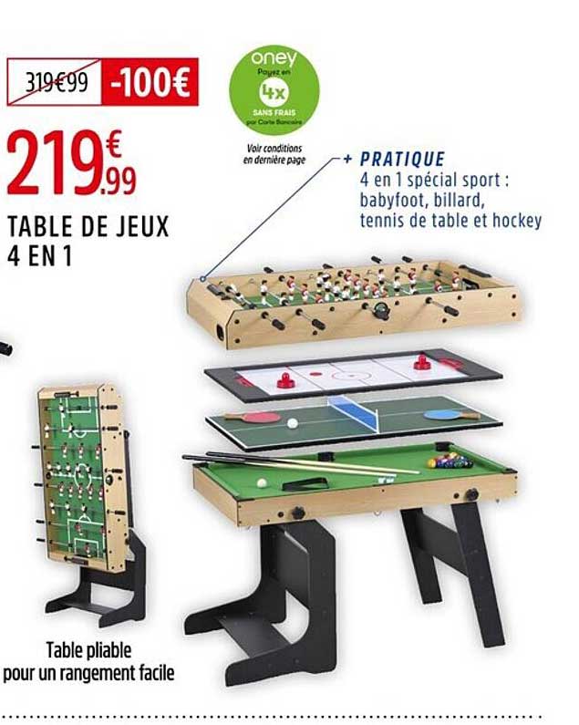 Découvrez une incroyable offre sur la table de jeux 4 en 1 qui vous promet des heures de plaisir entre amis et en famille. Avec cette table, transformez votre salon en véritable salle de jeux et profitez d'un moment de convivialité inoubliable. Du babyfoot au billard, chaque jeu est conçu pour offrir une expérience de jeu optimale. Pourquoi hésiter ? Cette offre est parfaite pour les amateurs de loisirs créatifs et de compétitions entre proches.