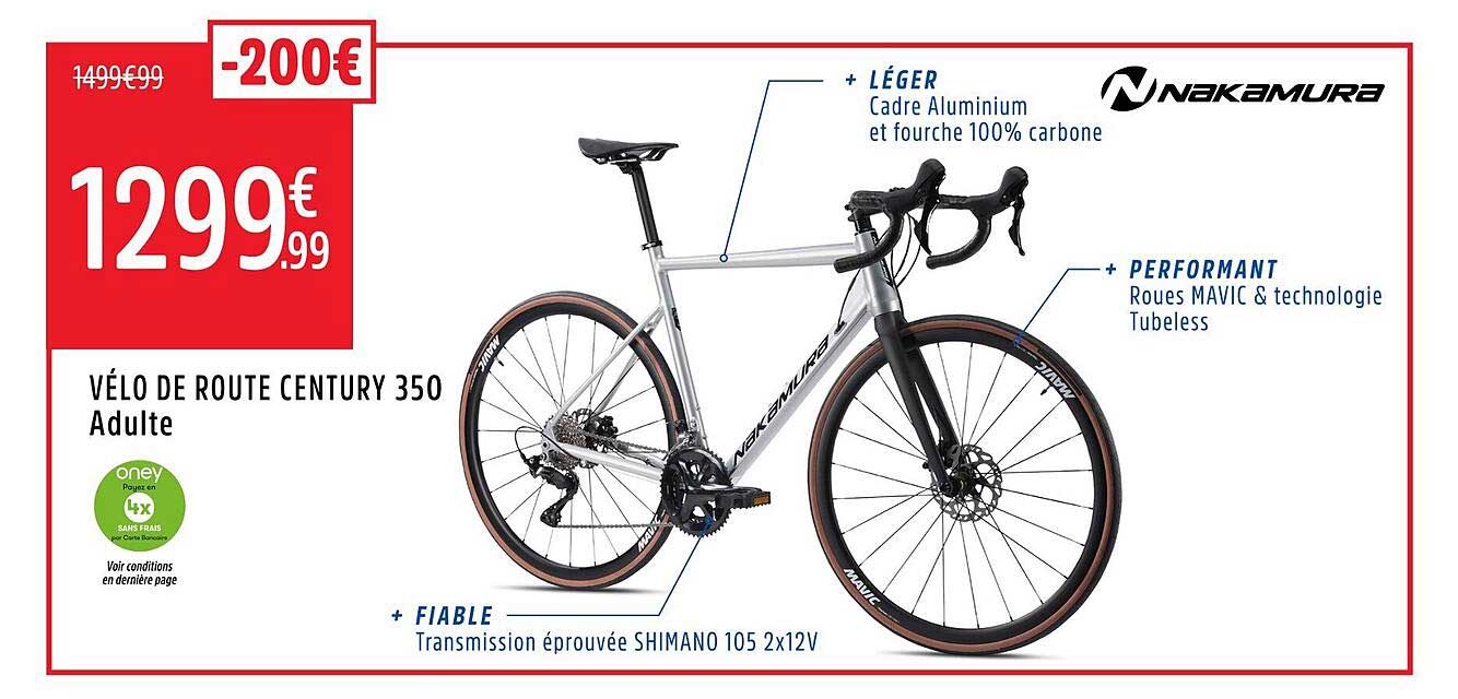Vous avez envie de liberté et de plaisir sur deux roues ? Ne cherchez plus, le Vélo de Route Century 350 de la marque Nakamura est fait pour vous ! Avec son cadre léger en aluminium et sa fourche 100 % carbone, ce vélo offre une expérience de conduite exceptionnelle. Profitez de cette offre valable jusqu'au 13 avril 2025, et roulez vers de nouvelles aventures !