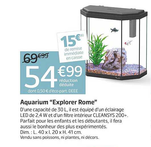 Découvrez l'aquarium “Explorer Rome”, un véritable bijou pour les amateurs d'aquariophilie ! Avec une capacité de 30 L, cet aquarium est parfait pour inviter un peu de nature chez vous. Il est particulièrement adapté aux enfants et aux débutants, mais saura également ravir les aquariophiles les plus expérimentés. Ne manquez pas cette opportunité, car cette offre est valable uniquement jusqu'au 16 novembre 2025 !