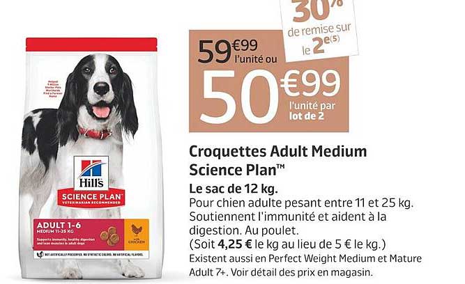 Les croquettes Adult Medium Science Plan™ se présentent en sacs de 12 kg et sont élaborées à partir de poulet savoureux. Leur texture est conçue pour favoriser une mastication optimale, garantissant ainsi une meilleure assimilation des nutriments. De plus, elles sont disponibles en versions Perfect Weight Medium et Mature Adult 7+ pour s'adapter à tous les besoins nutritionnels.