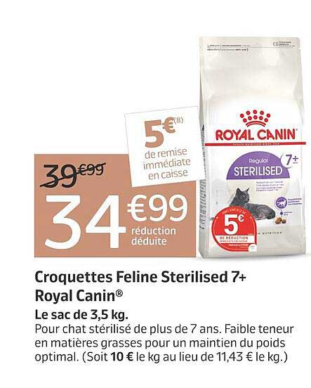 Vous êtes à la recherche de l'alimentation parfaite pour votre chat stérilisé de plus de sept ans ? Ne cherchez plus ! Les croquettes Feline Sterilised 7+ de Royal Canin® sont spécialement conçues pour répondre aux besoins nutritionnels des félins matures. Avec cette promotion, vous pouvez offrir à votre compagnon à quatre pattes une alimentation de qualité à un prix très avantageux.