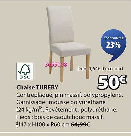 Au prix de 50€, la chaise TUREBY représente une véritable bonne affaire. En comparaison avec son prix habituel de 64,99€, vous réalisez une économie de 14,99€. C’est l'occasion parfaite pour améliorer votre décoration intérieure sans vous ruiner !