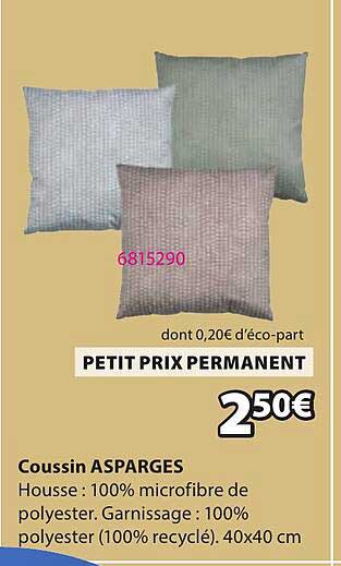Découvrez le coussin ASPARGES, une pièce essentielle pour apporter une touche de confort et de style à votre intérieur. Avec son prix imbattable de seulement 2,50€, c'est l'occasion rêvée de rehausser votre décoration sans vous ruiner ! Cette offre est valable jusqu'au 1er septembre 2025.